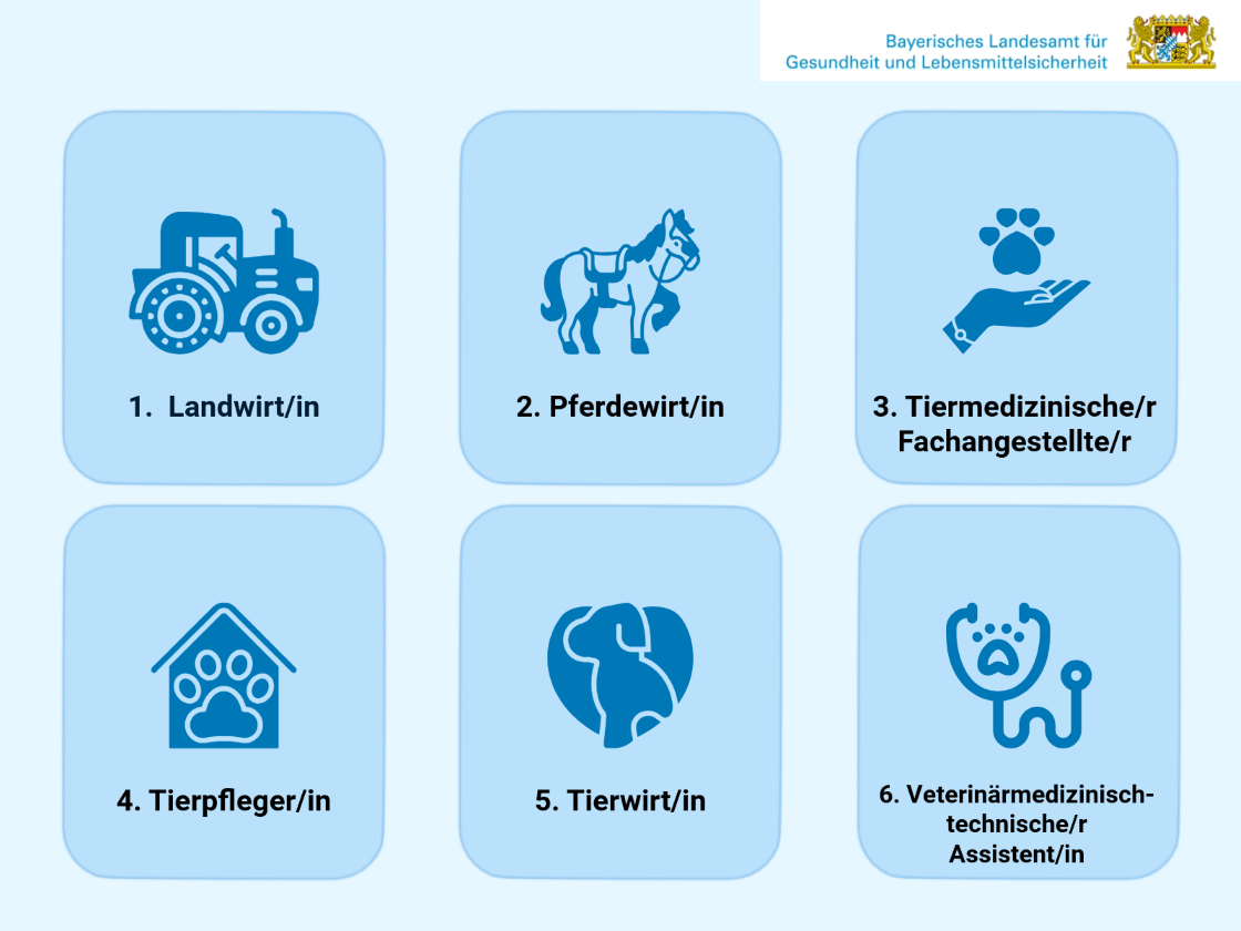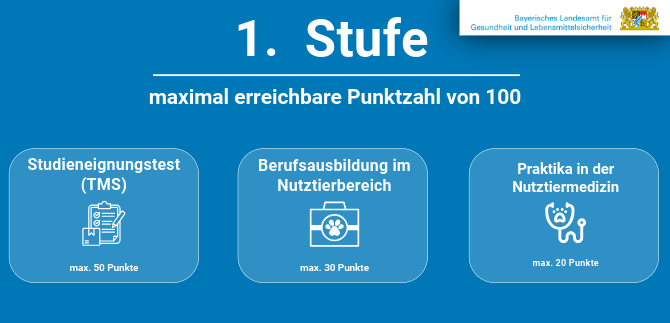 Der Studieneignungstest (TMS) wird nicht durch das LGL abgenommen, sondern muss vor der Bewerbung durch den Bewerber auf eigene Initiative absolviert werden. Bei den Berufsausbildungen sind Berufe mit Bezug zur Nutztierhaltung relevant. Die folgenden Ausbildungen werden berücksichtigt: