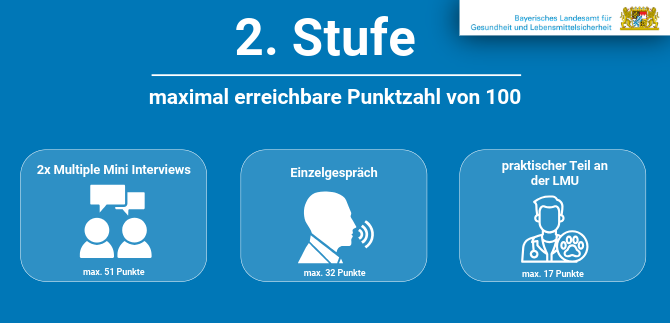 In einem zweiten Schritt finden strukturierte und standardisierte Auswahlgespräche statt. In den Auswahlgesprächen werden die relevanten Kernkompetenzen, die fachspezifische persönliche Eignung und Motivation der Bewerberinnen und Bewerber bewertet. Sie bestehen aus zwei Kurzinterviews, einem Einzelgespräch und einem praktischen Prüfungsabschnitt an der tierärztlichen Fakultät der LMU München.